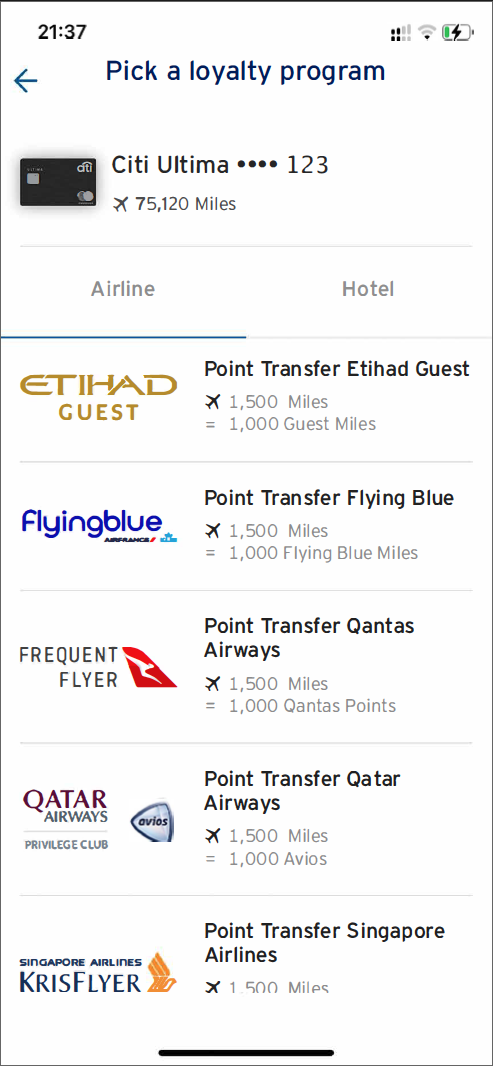 Citi Prestige Credit Card offers its users access to Citi's diverse point ecosystem. Card holders can convert their Citi ThankYou® point to 11 airline and hotel partners, some of them (such as Qantas) are only available to Citi.